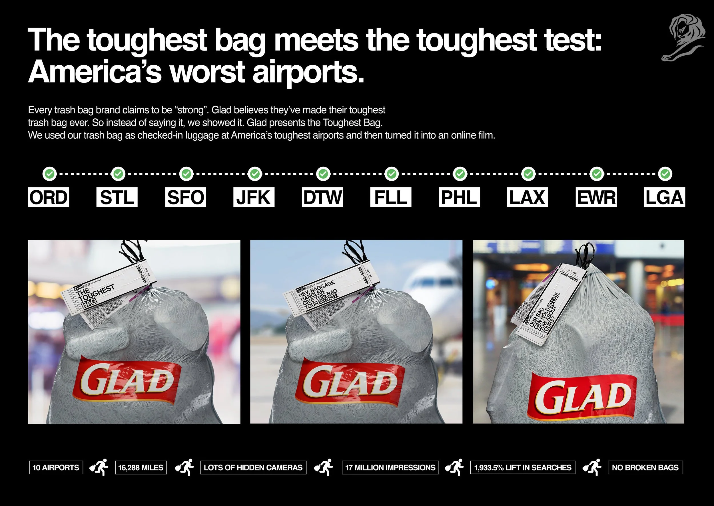 GLAD’s “Torture Tests” became one of the most brutally honest product demos ever filmed for the brand, and shared by people who were tired of gimmicks and ready for proof. A trash bag became a suitcase. A suitcase became a statement. And a category known for overpromising finally had one brand that overdelivered. Because toughness isn’t a claim. It’s a check-in.